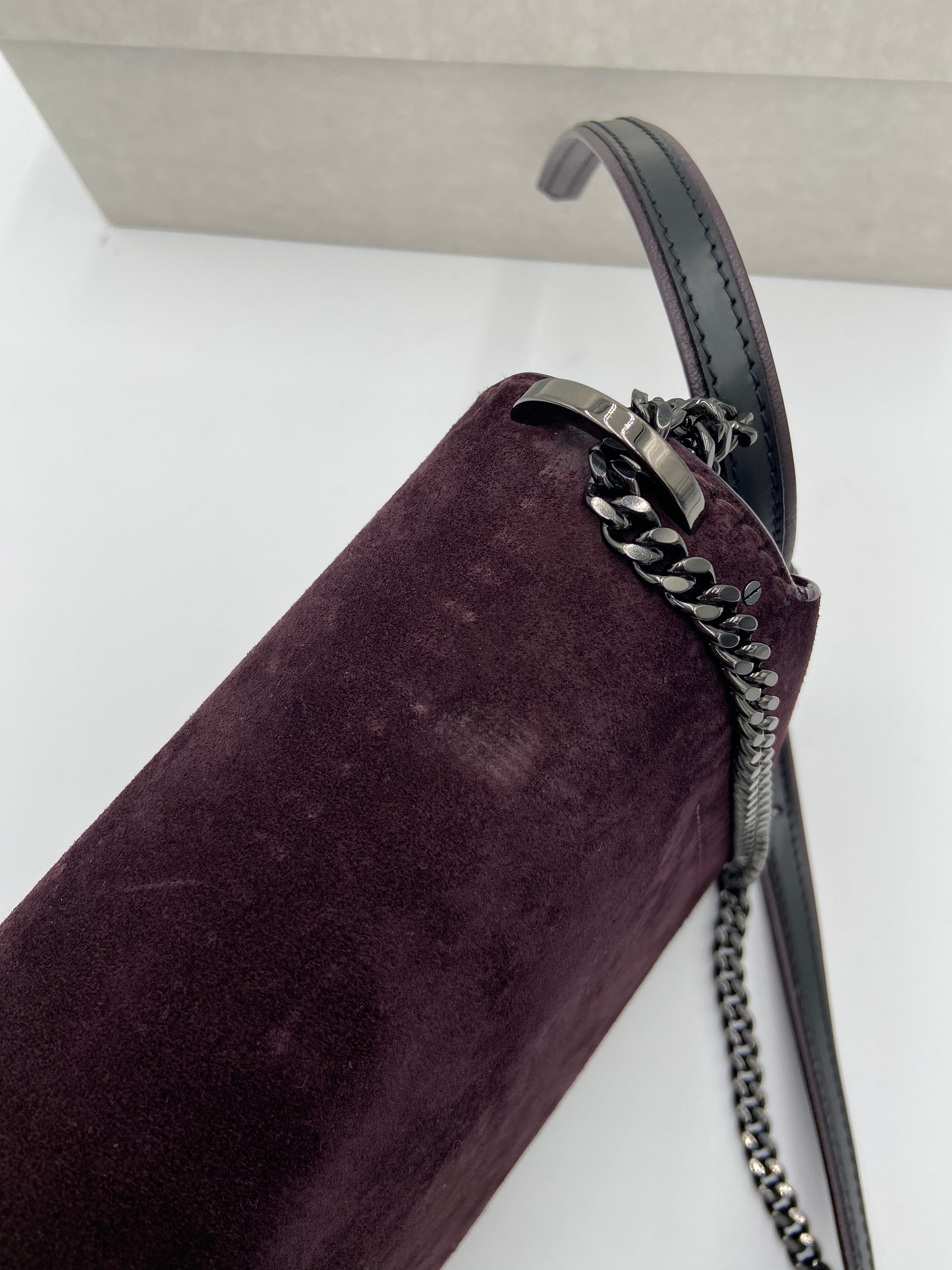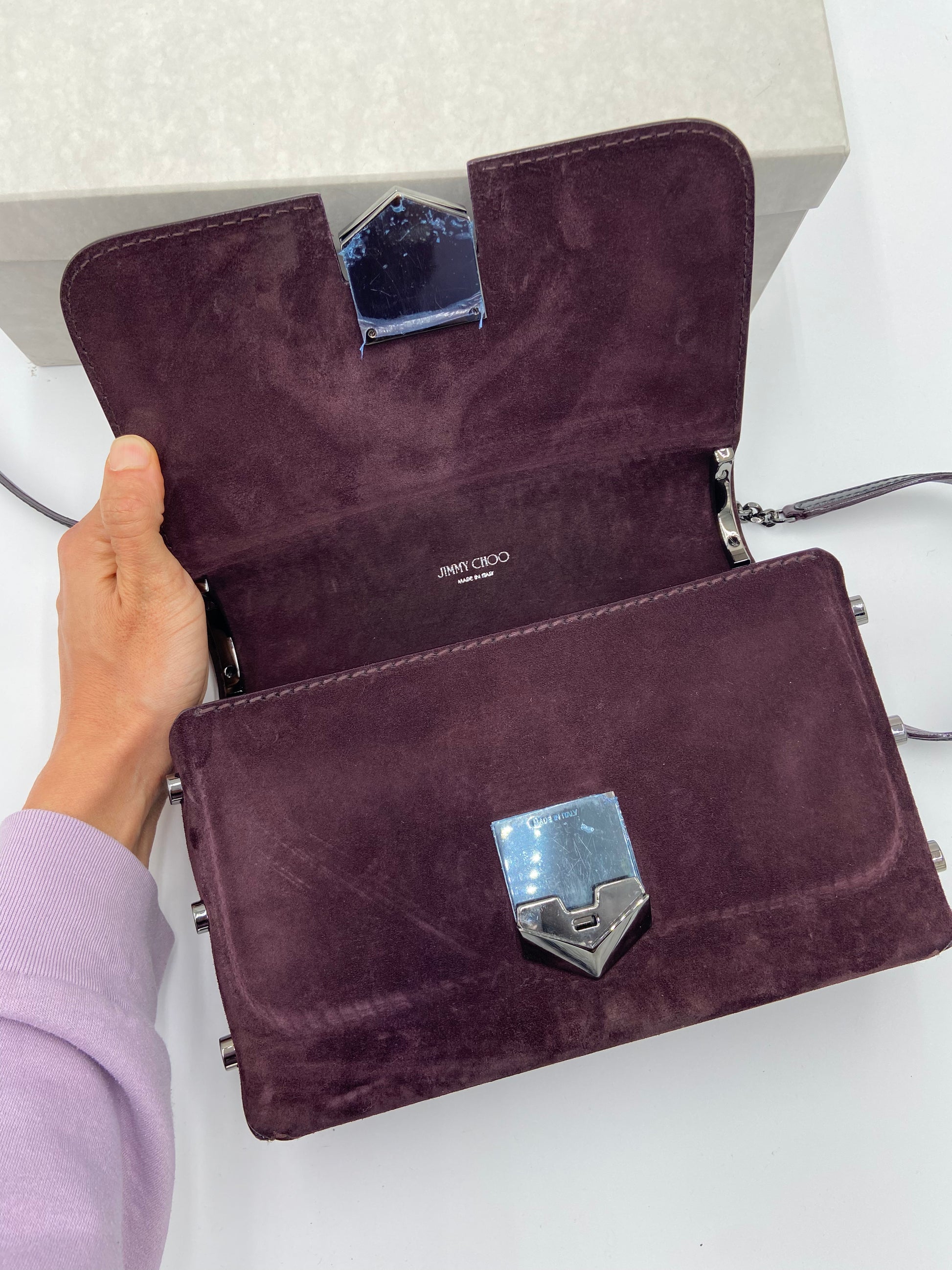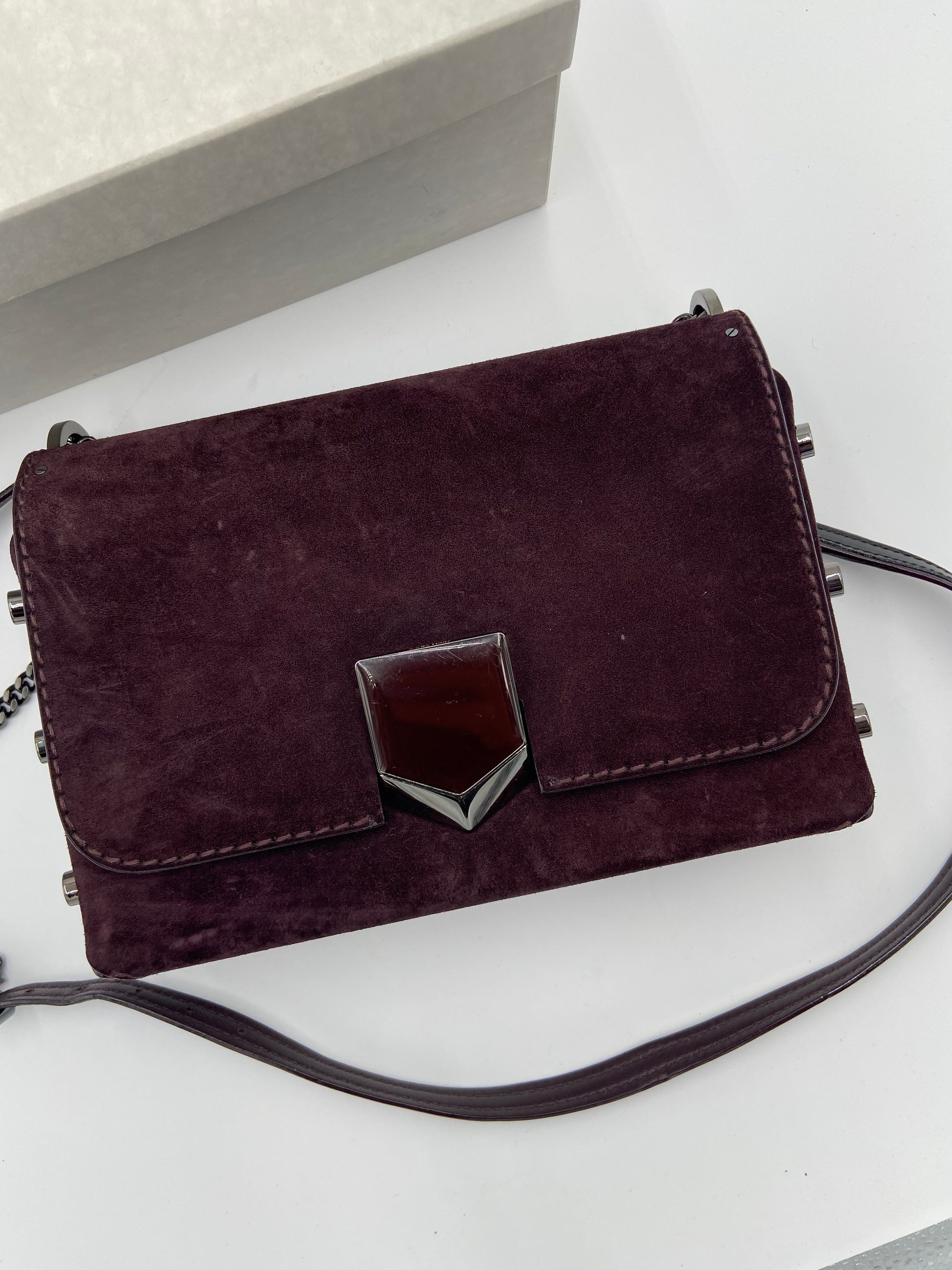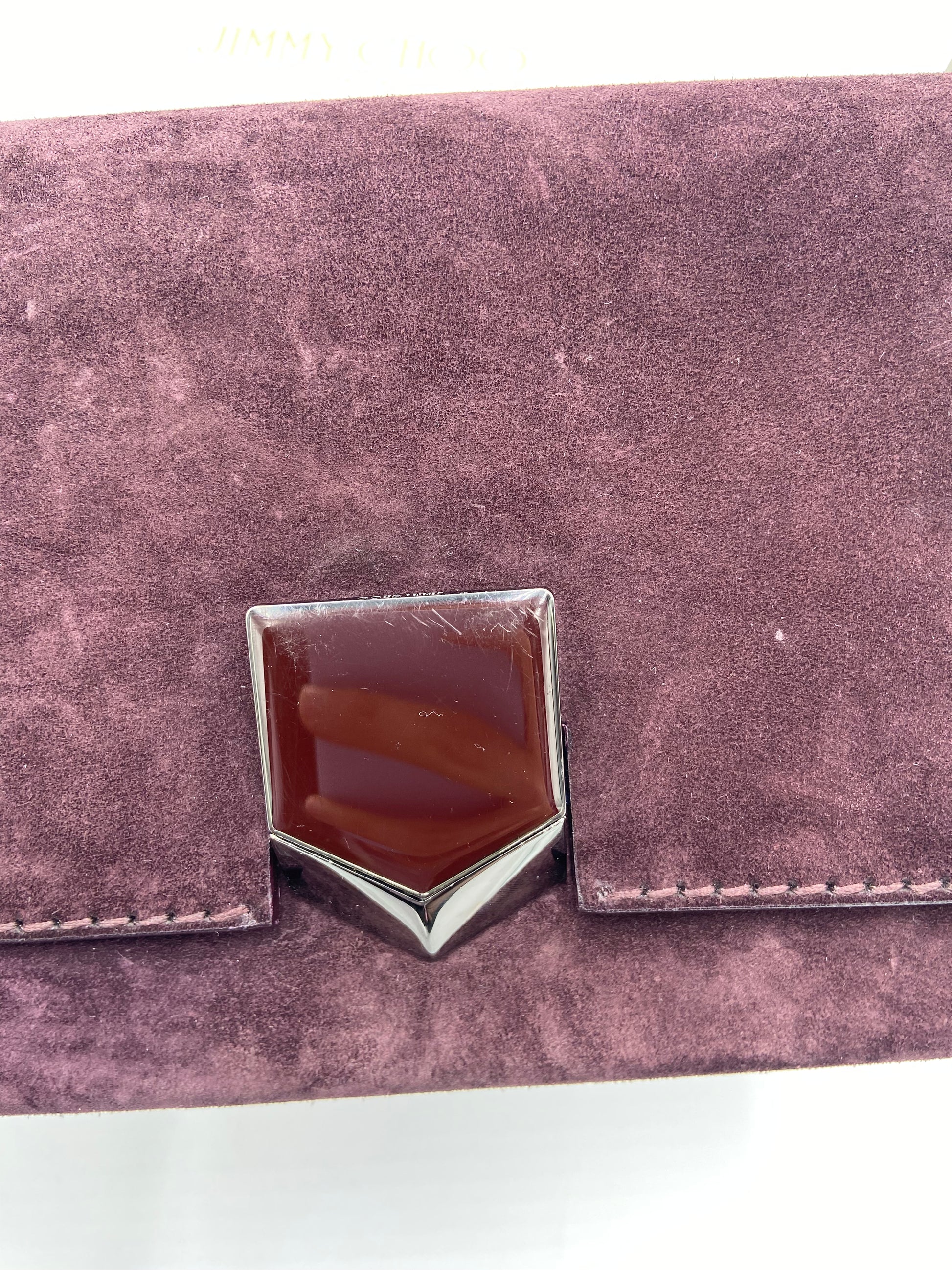 overall great condition. light marks on suede from rubbing - some scratches on front hardware - interior hardware still has stickers on.
