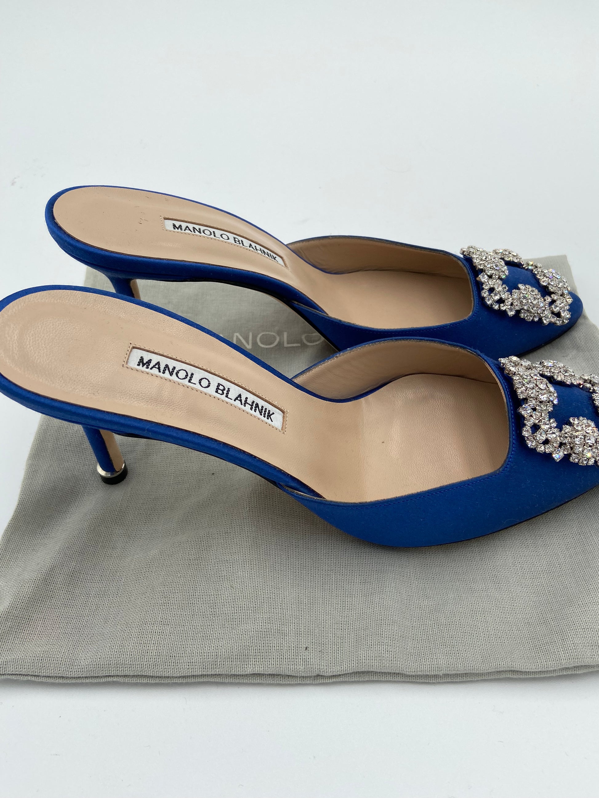 Manolo Blahnik Blue Satin Jewel Buckle Mules size 38